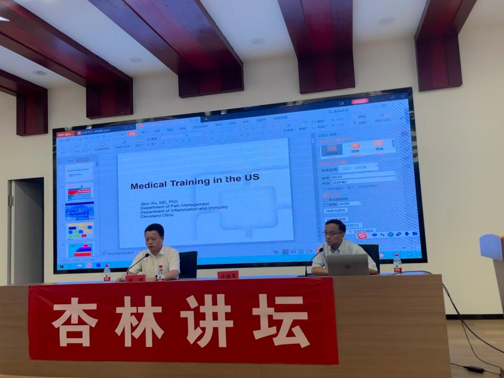 6月11日,yl永利集团官网登录新一期“杏林讲坛”在仁心楼党员教育基地培训教室举行。美国德克萨斯大学神经科学博士、克利夫兰医学中心疼痛科临床医师许继军教授主讲,嘉兴公司附属医院经理姚明主持。yl永利集团官网登录师生代表50余人到场聆听。