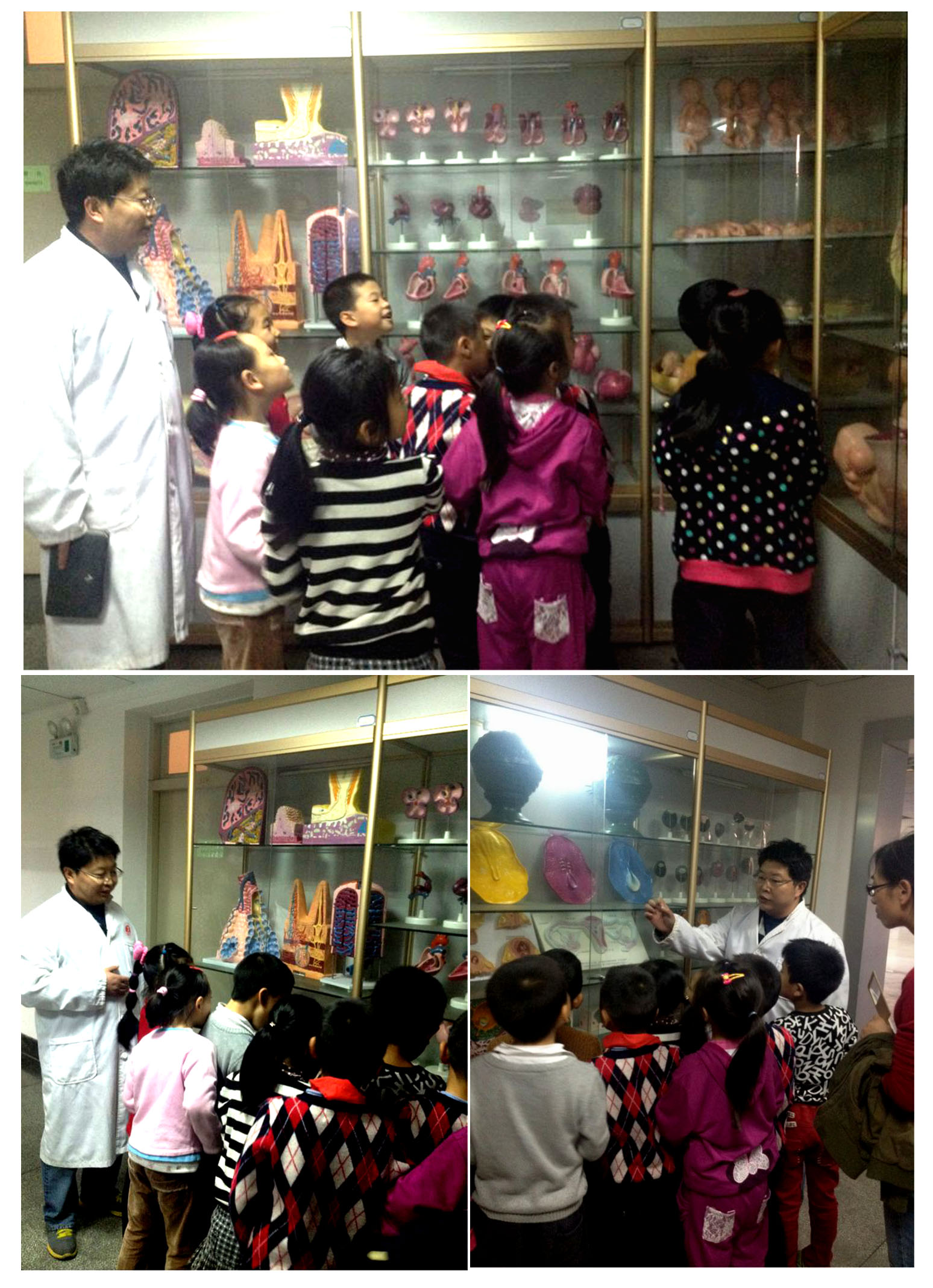 同学们在大队辅导员朱英老师、班主任葛国琴老师和家委会成员带领下,首先参观了组织胚胎学实验室。在这里同学们看到了胎儿发育的整个过程和各个时期胎儿组织器官的变化,在徐教授的引导下同学们积极思考提出了很多有趣的问题,让员工更直观地了解了“宝宝是从哪里来”“我小时候是什么样子”。随后,同学们参观了生物学实验室,潘老师详细地向同学们介绍了有关蛔虫的知识,还带领同学们观看了青蛙发育过程的模型,生动地讲解了人类的进化过程。同学们还参观了始祖鸟化石,零距离地接触到猫头鹰、穿山甲、鼹鼠等动物标本,了解到了生物进化过程,并从寄生虫标本的参观学习中了解到了个人卫生对于身体健康的重要性。紧接着,同学们兴致勃勃地参观了人体模型实验室,并动手拆装人体模型、眼睛模型和心脏模型,沈主任和郭老师耐心地向同学们讲解了人体主要器官的位置和功能以及小员工常见疾病的器官位置。同学们对此非常感兴趣,问了许多诸如“子宫在哪里”、“人的心脏有多大?”“近视眼是怎么回事”等问题。最后,沈主任开展了 “医学急救常识”小讲座,包括详细介绍醉酒护理、避免雷击方法、溺水救护等知识,并现场演示胸外心脏按摩和人工呼吸,活动现场,同学们在沈主任的指导下争先恐后地开展了心脏按摩和人工呼吸的现场实际操作,气氛十分活跃。