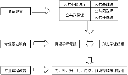 人体解剖学、组织学和胚胎学、生理学、生物化学、医学微生物学、医学免疫学、病理学、病理生理学、药理学、预防医学、诊断学、内科学、外科学、妇产科学、儿科学等