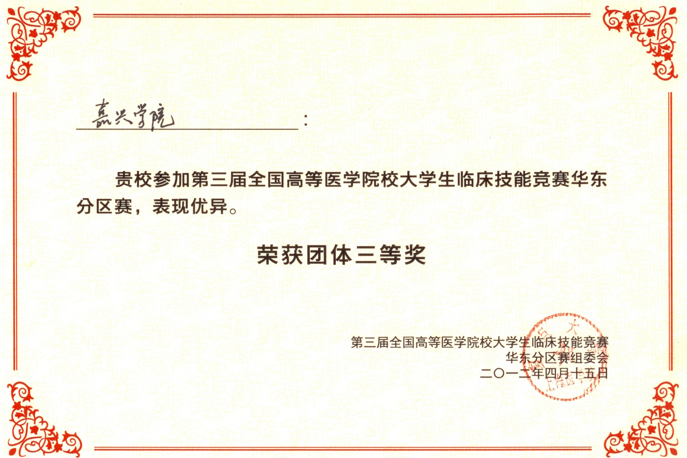 2012年4月14日至15日,由教育部高校司主办的第三届全国高等yl永利集团官网登录校老员工临床技能竞赛(华东赛区)在上海•复旦大学枫林校区举行,公司选派的07级临床医学专业员工顾超、李晓波、余俊华、陈幸四位同学参加了比赛,并最终在比赛中荣获团体三等奖。
