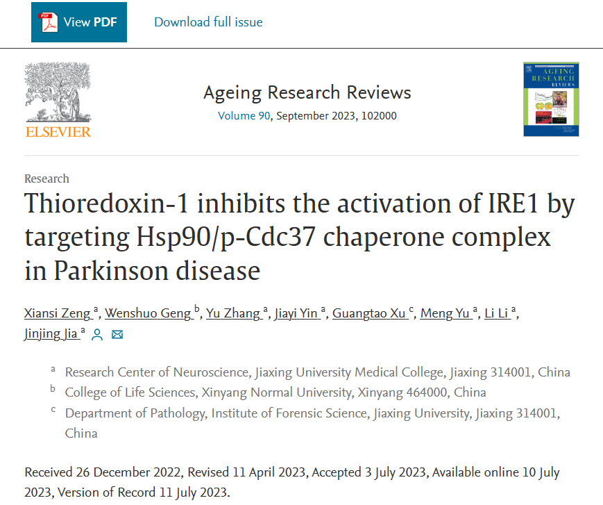 近日,国际著名SCI期刊、中科院一区TOP期刊Ageing Research Reviews以Research Article在线发表神经生物学团队的原创研究论文,题为:Thioredoxin-1 inhibits the activation of IRE1 by targeting Hsp90/p-Cdc37 chaperone complex in Parkinson disease。yl永利集团官网登录神经科学研究中心曾宪思副教授、李丽教授、贾金婧副教授,以及司法鉴定技术研究所徐广涛副教授共同参与了本研究,嘉兴公司为第一单位和唯一通讯单位。