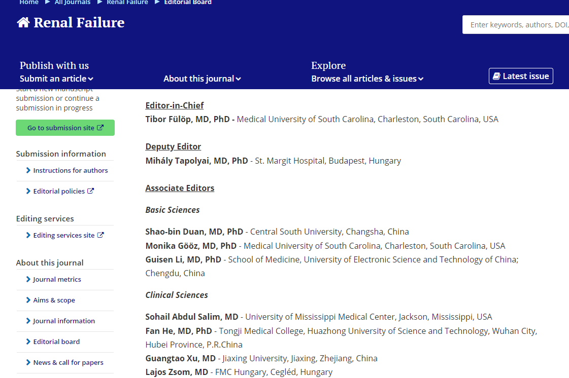 Renal Failure是Taylor&Francis出版社旗下的传统期刊,创刊于1976年,主要发表基于急性肾损伤、慢性肾损伤、慢性肾功能衰竭、高血压和肾移植领域的基础与临床相关研究创新成果,是国际肾脏病学领域的知名SCI收录期刊。该期刊至今已出版45卷(卷/年),最新影响因子3.222,为JCR Q2区期刊、中科院大/小类3区期刊。