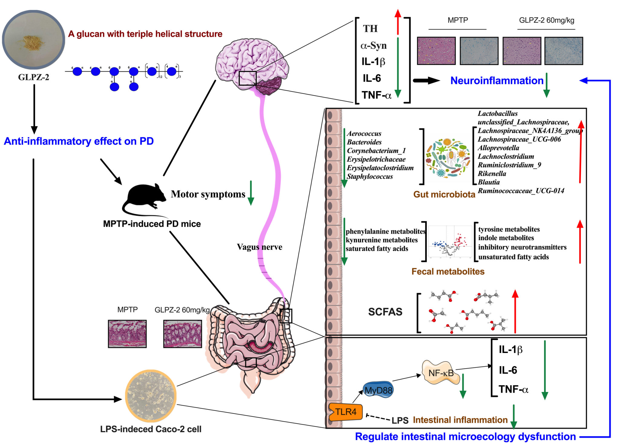本研究对从灵芝中分离得到的一种纯化灵芝多糖GLPZ-2进行了详细的结构解析,并以LPS与TLR4的识别和结合模式为思路研究了GLPZ-2基于肠-脑轴改善帕金森病神经炎症的作用机制。GLPZ-2是一种具有三螺旋结构的葡聚糖,其主链主要由1,6-α-D-Glcp、1,4-α-D-Glcp、1,4,6-α-D-Glcp和1,3,6-β-D-Glcp组成,在C-3和C-4位有分支。GLPZ-2通过抑制肠道TLR4/MyD88/NF-κB通路,有效调节帕金森病小鼠肠道微生态,缓解病理损伤,改善神经炎症。本研究对认识肠-脑通讯具有理论意义,也对基于肠-脑理论治疗帕金森病的中医药方案的提出具有实际意义。