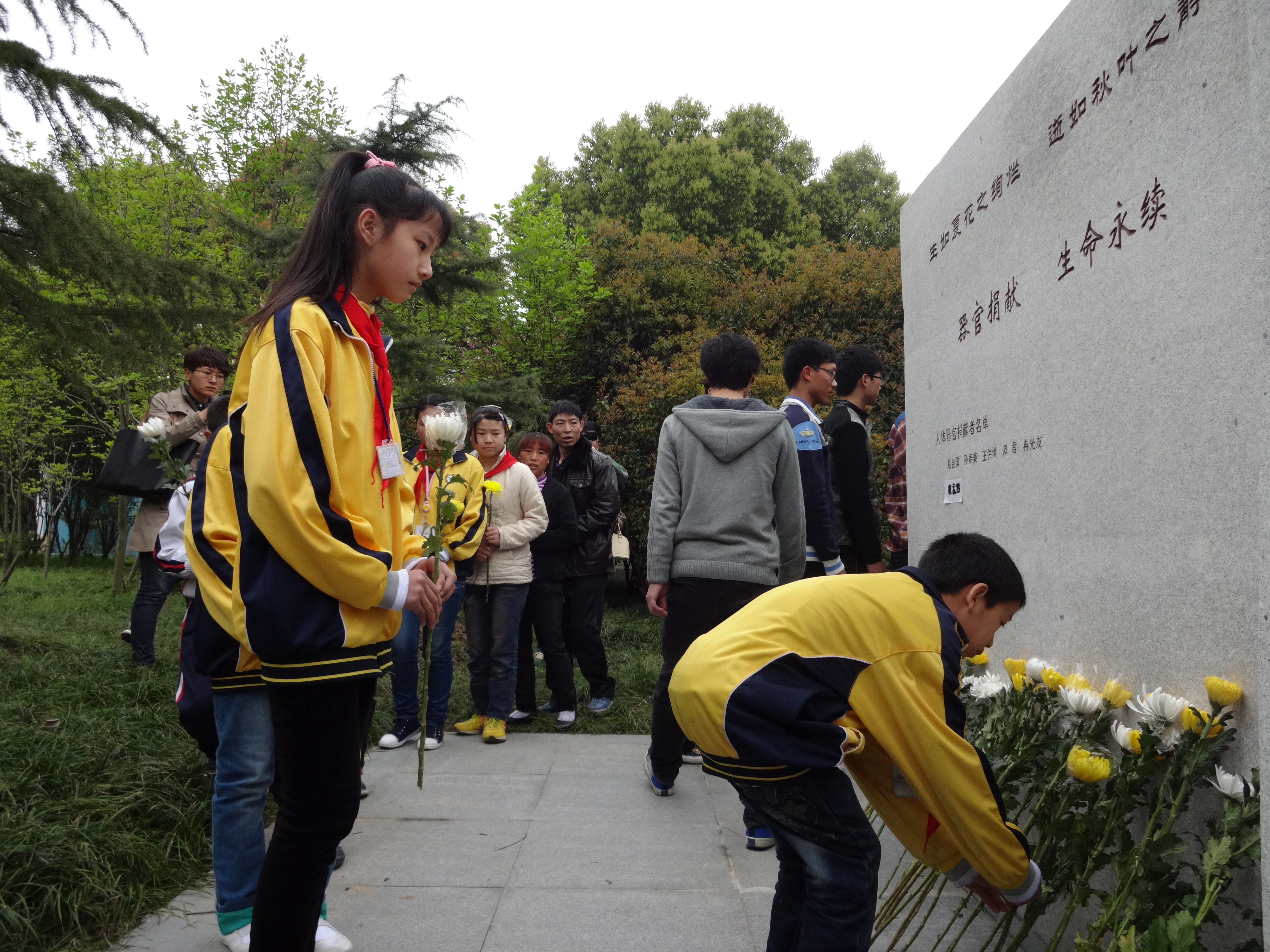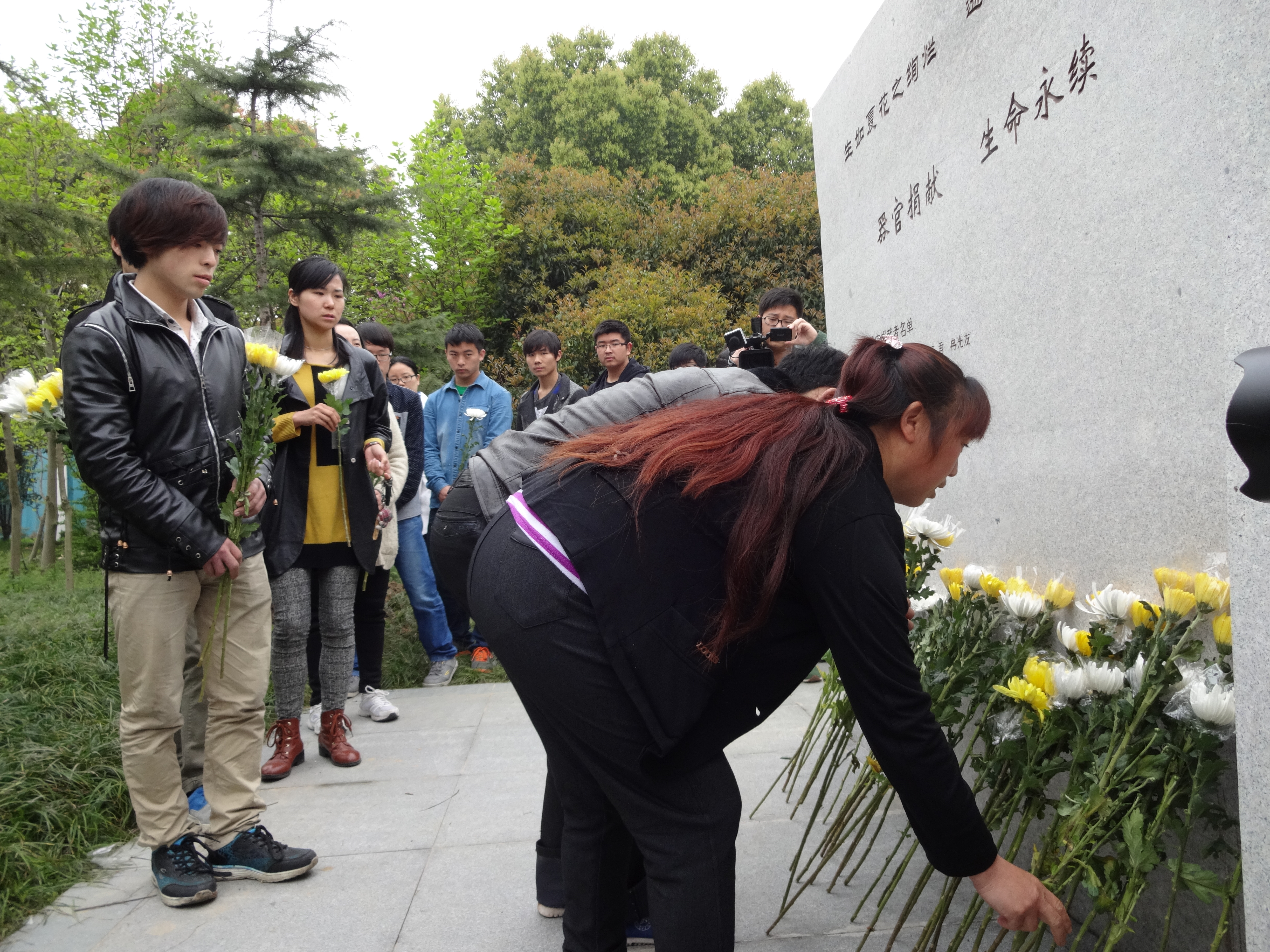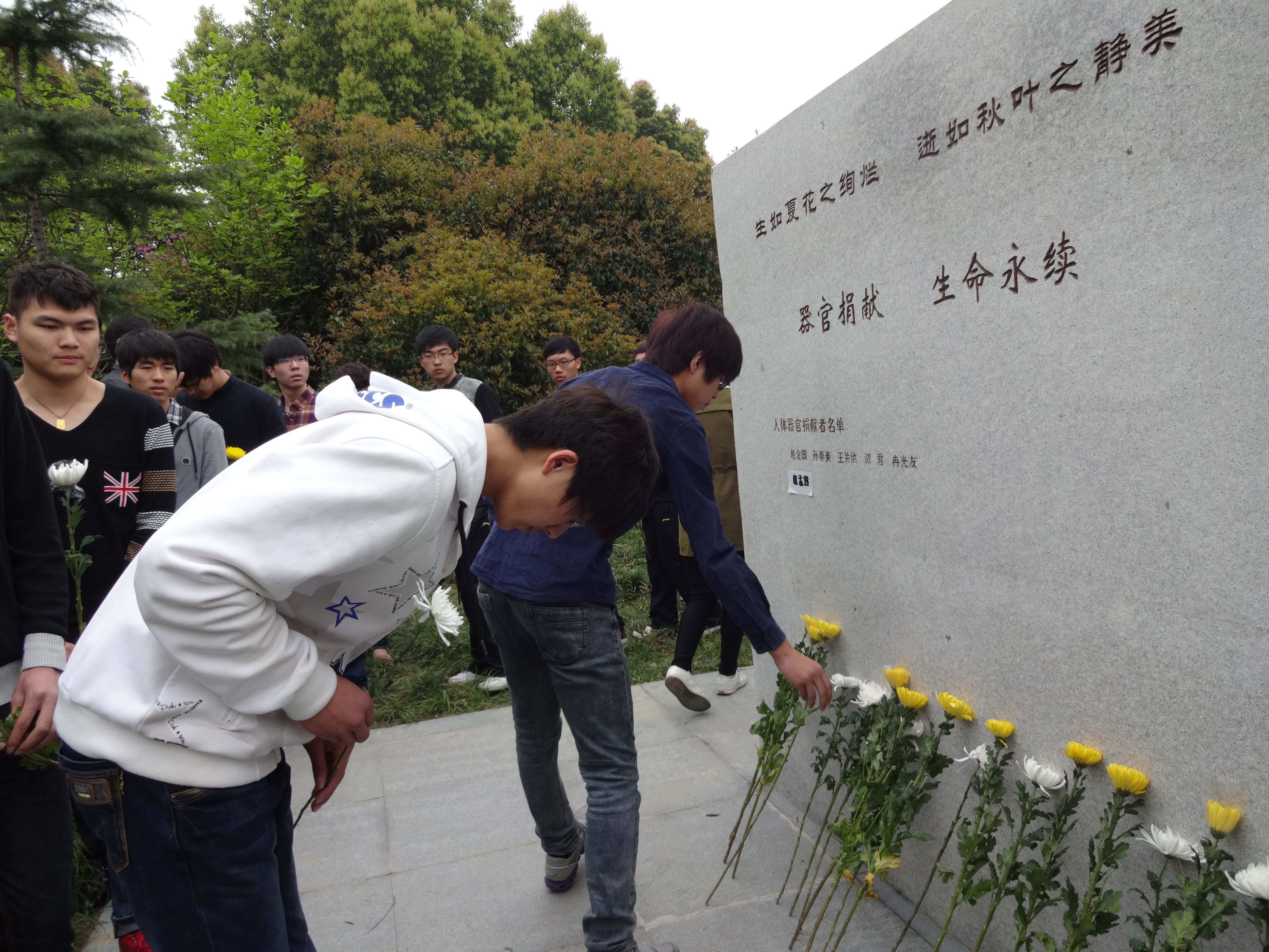 遗体器官捐献者家属、嘉兴红十字会代表、公司教师代表、员工代表手持菊花,庄严、肃穆的站在傲然耸立的无语良师碑前,全场默哀三分钟,向无语良师的高尚灵魂表示哀悼。全体人员低着头,看着手中的菊花,脸上弥漫着严肃、敬仰之情。同时员工代表朗诵诗歌赞美遗体器官捐献者高尚的品格与情操,宣读倡议书呼吁更多的人关注遗体器官捐献事业和为新晋无语良师英名描红。其中有位家属代表大家发言,他讲述了自己93岁的老父亲,说服子女与妻子在他去世之后将自己的遗体捐献出去,为医学事业尽自己的一份绵薄之力,造福更多的人,这种崇高的精神值得我们学习。最后,全体人员手持一朵菊花走向无语良师碑前,鞠躬、献花,表达自己的敬慕之情。