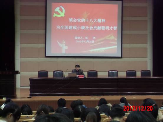 2012年12月20日晚在嘉兴公司yl永利集团官网登录TCL报告厅,由公司党总支书记张杰老师宣讲以《领会党的十八大精神,为全面建成小康社会贡献聪明才智》为主题的讲座。公司团学干部、各班班团干部、全体员工党员以及2011-2012学年第二学期评奖评优各类获奖代表参加。