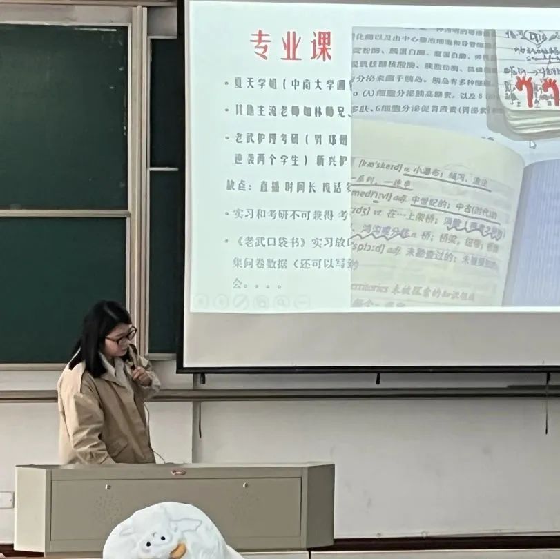 随后,护本192班郭蕴瑜、护理N192班尹雨爽两位学姐进行考研经验分享。郭蕴瑜学姐目前已被浙江大学护理专业拟录取,尹雨爽学姐以第一名的成绩被绍兴文理公司护理专业拟录取。她们热情地分享了自己的学习方法,给予了学弟学妹们贴心的指导。