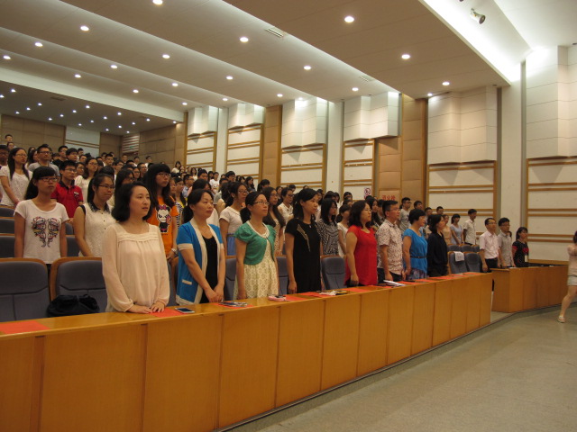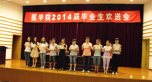 在激扬的国歌声中,大会正式开始。黄嬛副经理首先宣读优秀毕业生名单,其中省级13名,校级51名,院级29名。王敏副经理随后宣布各优秀员工名单,其中考取研究生24名,优秀实习生10名以及在2014年度华东赛区及浙江省老员工医学竞赛中获奖人员18名。随后,党委副书记黄金珠老师就毕业生就业情况进行通报,并有请毕业生代表徐海琦同学与教师代表黄越燕老师发言。最后,孟继鸿经理致词,寄语毕业生们要适应社会,志存高远,坚定理想,坚信天道酬勤,表示母校是你们永远的精神归依,你们是老师永远的骄傲和牵挂。