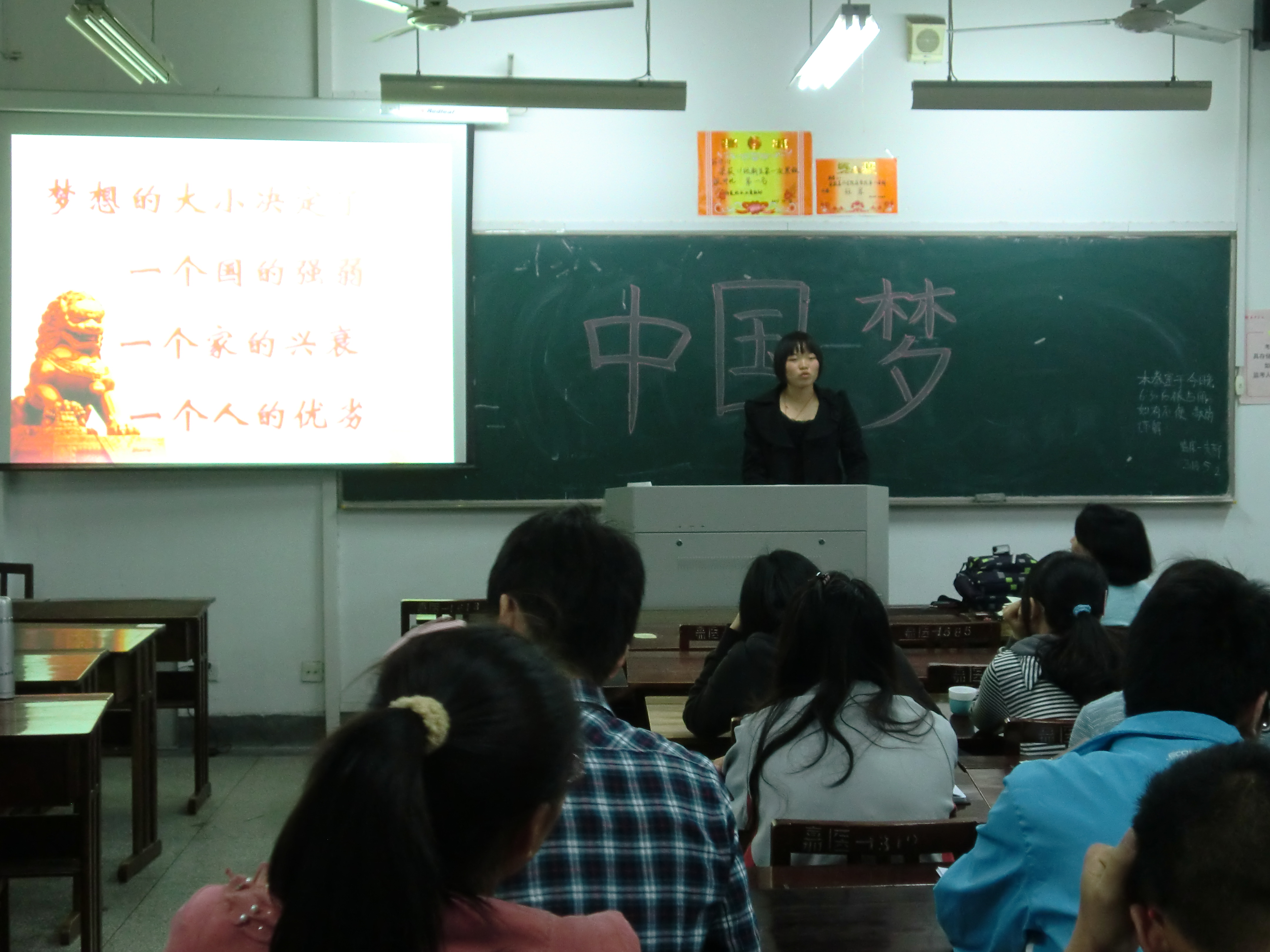 接着同学们通过PPT的形式学习了“中国梦”的由来、原文、三大动力、具体内容等,明白了“中国梦”的核心是实现中华民族的伟大复兴,并通过观看视频加深了对中国梦的理解。在学习过程中,同学们还结合自己从网络、报纸了解到的信息,从外交、军事、经济等方面交流和畅想了中国梦。
