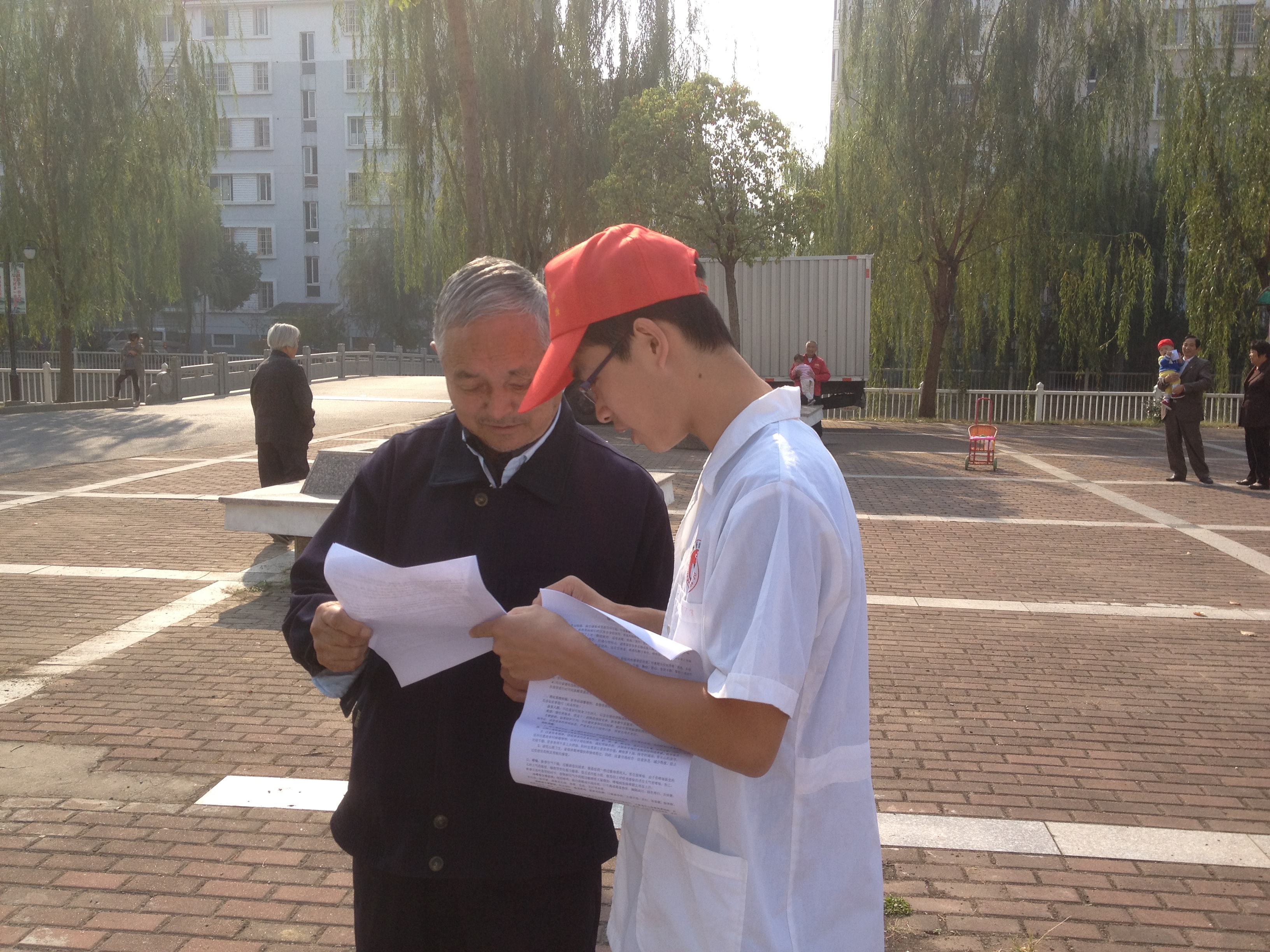 2012年10月19日上午9时左右,嘉兴公司yl永利集团官网登录医本091/092支部十名党员同学在金穗社区广场开展志愿者服务活动,吸引了现场很多老人和小孩参与。
