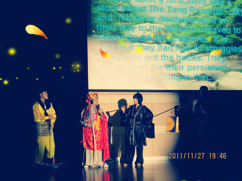 伴着观众热烈的掌声,晚会以一首由yl永利集团官网登录乐队带来的活力四射的《王妃》开始,铿锵有力的节奏带动了全场观众的热情,在充满异域风情的印度舞表演之后,大屏幕上依次播放了获得本届“优秀社团”称号的笛箫协会、街舞协会、吉他协会和荧光爱心社的精彩视频。一场别开生面使人捧腹大笑的英语话剧《三打白骨精》更是让晚会达到了一个高潮,精彩的演出之后再次揭晓了“最佳社长风采奖”的获得者——国标协会会长孙源和女生会馆会长林晓东。
