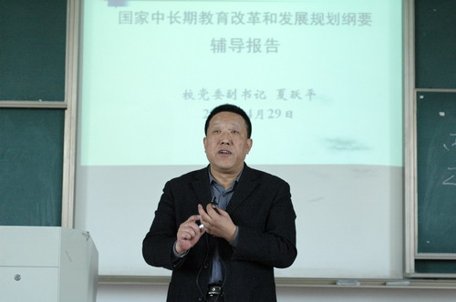 夏书记的报告从中国现代意义大学发展的历程、目前高等教育发展中存在的问题、纲要中涉及高等教育的亮点以及对公司改革发展的思考等四个方面,运用典型的案例、翔实的数据和自身学习工作经历,对《国家中长期教育改革和发展规划纲要》的政策背景、重大意义、高等公司改革主要内容、战略目标和主要任务作了分析和讲解,并针对高等教育中存在的同质化、行政化、人才培养质量不高等问题,强调必须把提高质量作为核心任务,加强学科团队建设,要准确定位、抓住机遇、办出特色。最后,夏书记向大家介绍了公司正在研究制定的校内管理体制机制改革方案的总体思路和目标。
