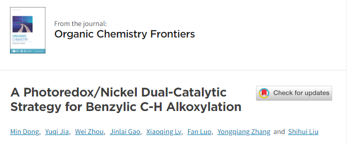 近日,公司药学系青年教师刘石惠博士以通讯作者身份在英文期刊《Organic Chemistry Frontiers》发表了论文“A Photoredox/Nickel Dual-Catalytic Strategy for Benzylic C-H Alkoxylation”(DOI: 10.1039/D1QO01421H),嘉兴公司为该论文的第一通讯单位。药学18级员工董敏和药学20级员工贾雨琪为论文的共同第一作者。
