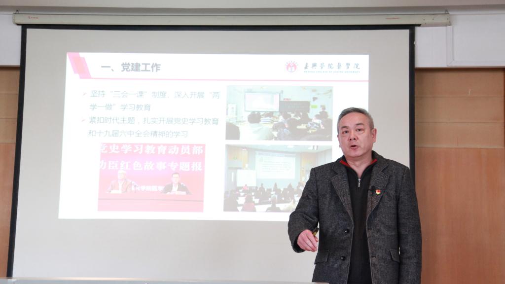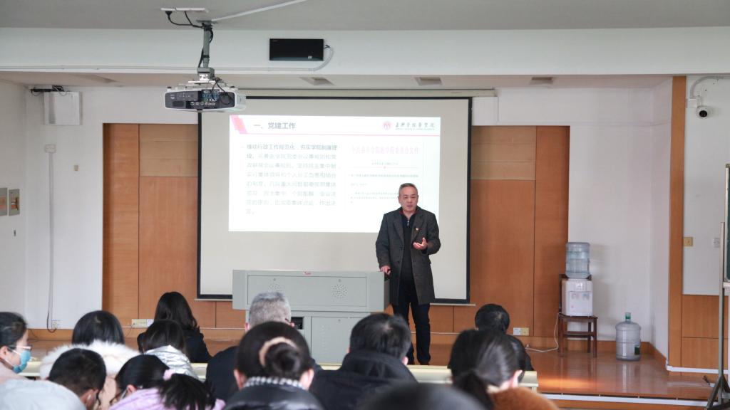 公司党委书记陈云飞代表公司党政班子向全体教职工作公司2021年度工作汇报,陈云飞从党建工作、教学工作、团队建设与科研、团队队伍建设、员工工作等五个方面进行了汇报。