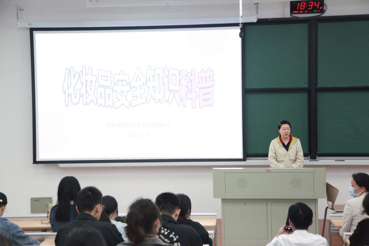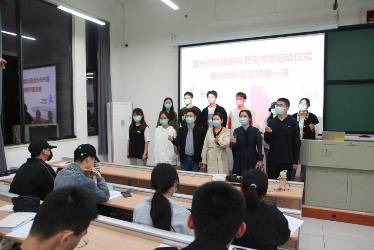 为进一步激发药学员工对本专业的学习兴趣,提升对药品和化妆品安全意识,2022年5月12日,药学系联合嘉兴市市场监督管理局进行药学成长导航系列活动暨嘉兴市化妆品科普宣传周启动仪式校园科普宣讲,参加活动人员有嘉兴市市场监管局药品与化妆品监督管理处处长刘曦、嘉兴市食品药品检测院经理沈春燕、 嘉兴市药品化妆品不良反应中心副主任陈晨、药学系主任黄越燕及专任教师黄雄、张晓勤,药学专业大一全体员工及其他公司员工共计150人参与此次活动。