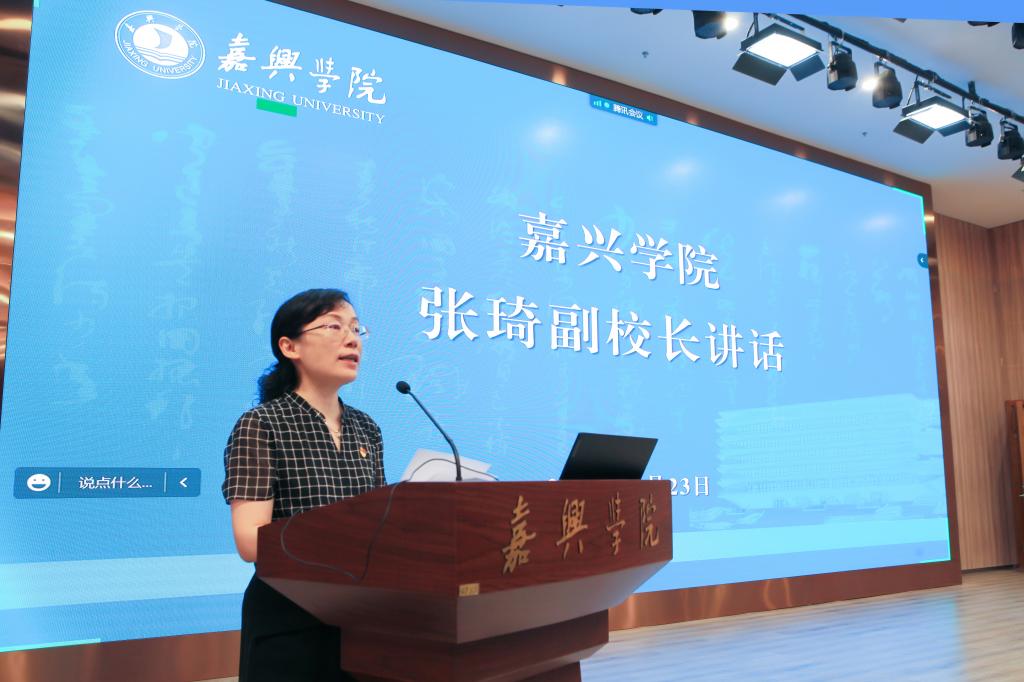 张琦副董事长致辞,她表示,多年来嘉兴公司充分发挥在中国革命红船起航地办学的政治优势、长三角一体化发展的战略优势,大力弘扬伟大建党精神、红船精神,坚定不移走内涵发展与应用型办学之路。在省市两级党委政府与社会各界大力支持下,公司正全力以赴建设“有特色、善创新”的一流应用型综合性大学。
