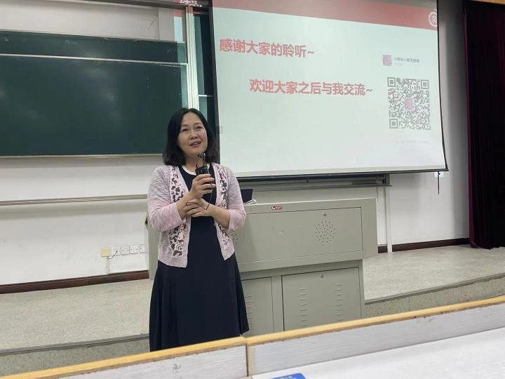 徐老师于2021年9月至2022年6月期间,在北京大学护理公司做访问学者。在讲座中,徐鋆娴老师从“初识北大”、“教学工作”、“科研工作”、“生活与感悟”介绍了自己访学的基本情况。在参与教学和科研工作中,北京大学护理公司孙宏玉教授团队严谨的学术态度和浓厚的学术氛围给徐老师留下了深刻的印象,团队教师们严谨的学术态度以及每周投入大量时间和精力组织组会及课题推进会,促成了高质量科研成果的不断产生。最后,徐鋆娴老师表示,希望同学们以北大护理的严谨治学精神勉励自己,注重隔热积淀,同时从关爱自己出发,正确认识自己,关爱家人,进而提升自己的职业素养,能够在进入临床实践和工作时关爱护理对象。
