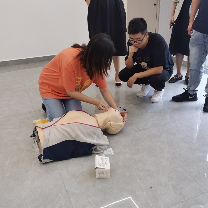 “高质量的心肺复苏,需要给予足够深度的、足够的按压频率和深度,每次按压后要使胸壁完全回弹……。”急救培训活动中,蒋主任为大家讲解了救护概论、心肺复苏及AED使用理论及实操,并作了现场演示和指导。