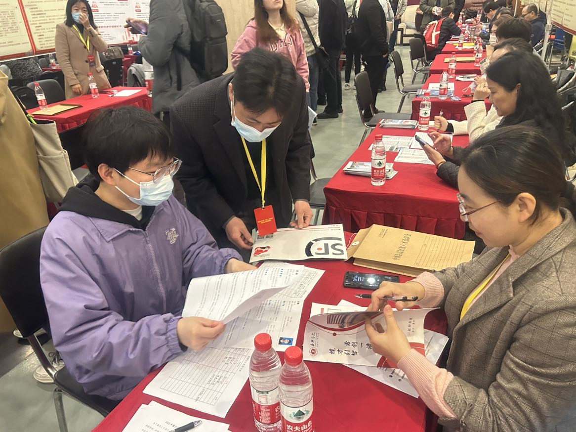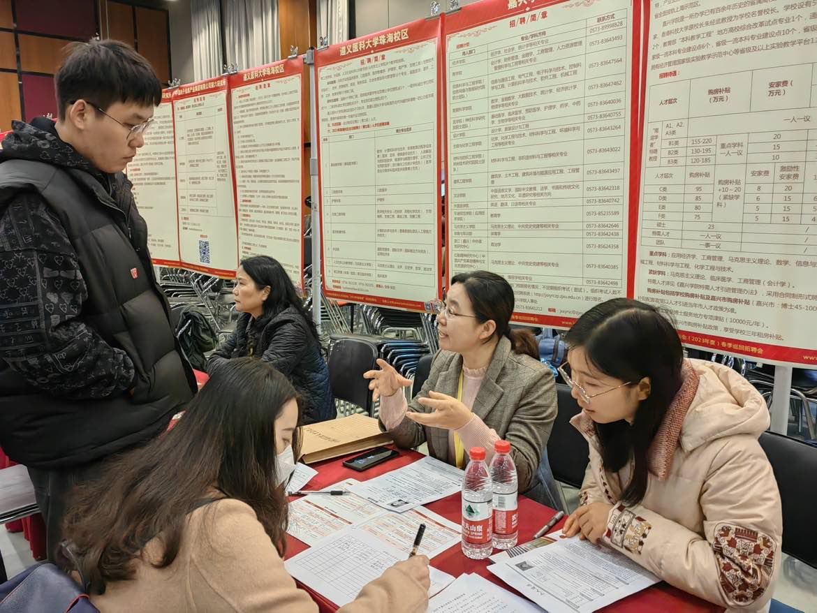 三位老师在嘉兴公司的招聘海报前向前来咨询的硕博士人才介绍嘉兴公司的基本情况,解答他们的疑问,与他们进行沟通和交流。