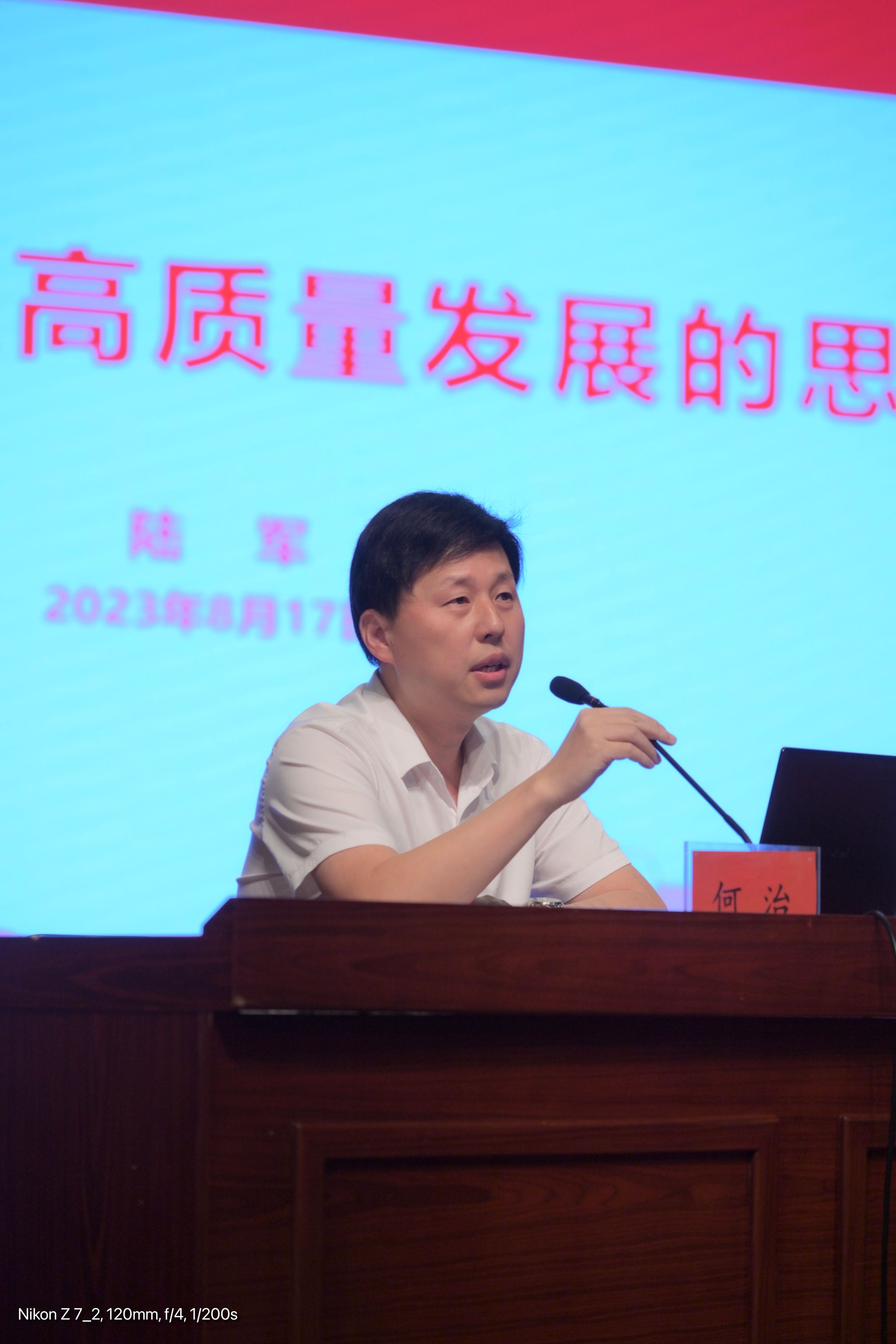 首先,经理何治传达嘉兴公司暑期中层干部读书会上董事长陆军院士关于《公司有组织高质量发展的思考》专题辅导报告精神。他强调,全院师生员工要以“努力把公司办成一所有特色、善创新的综合性大学,培养出更多适应经济社会发展需求的高素质人才”为指引,深入实施“1358”战略部署,通过“六减”“六增”改革建设举措,有组织高质量地发展公司各项事业。在公司新学期工作部署会上,经理何治希望全体教职工要“主动求变、主动适应、积极作为”,力争在学科培育、科研团队、团队队伍、专业及课程建设、省级重点实验室、硕士学位授予点、ESI学科排名、直属附属医院建设等方面取得新的突破,科研创新能力显著提高,服务地方卫生健康事业的能力显著增强。他还就公司新一轮本科公司产品审核评估作了动员讲话。
