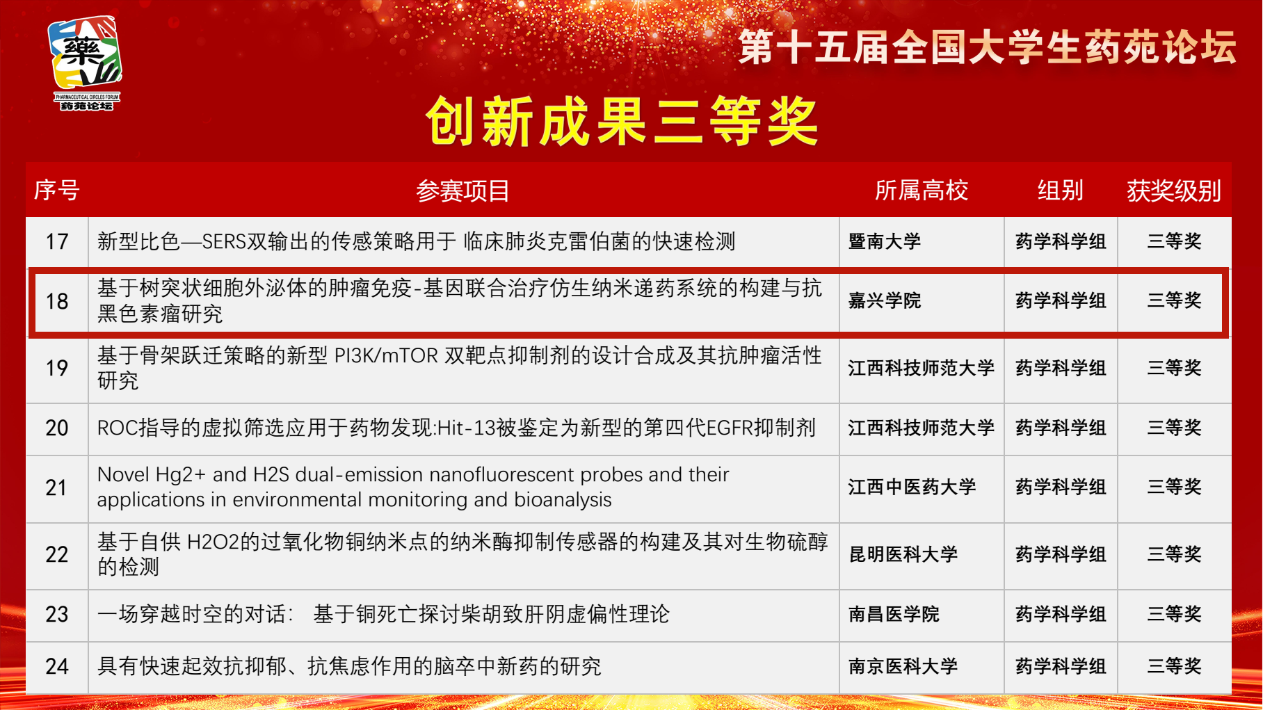 公司药学专业20级张飞琴同学团队(指导老师:张洁、丁宝月)完成的研究成果《基于树突状细胞外泌体的肿瘤免疫-基因联合治疗仿生纳米递药系统的构建与抗黑色素瘤研究》,荣获“创新成果三等奖”。