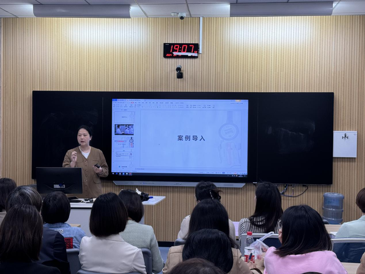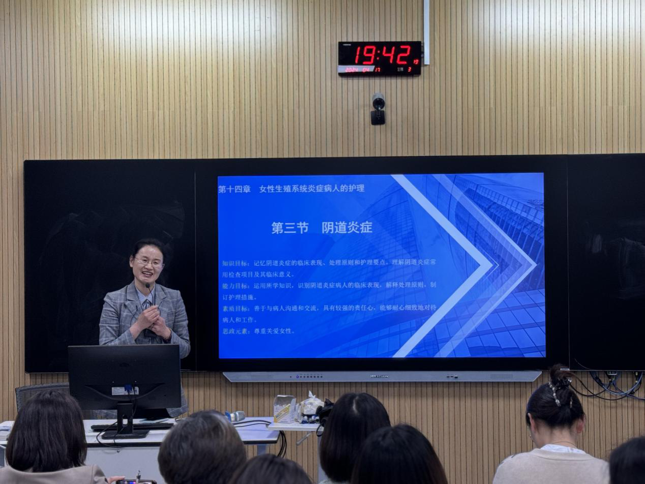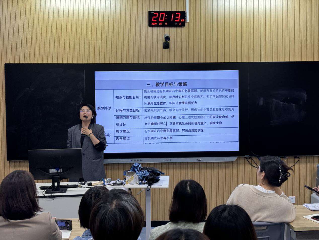 雷璇老师以“大肠癌患者的护理”为题,介绍了线上线下混合式教学的特点,分享了如何利用游戏、弹幕、头脑风暴等环节提高员工课堂参与兴趣。王艳萍老师以“上消化道出血”为题,从宏观上与大家探讨根据课程特点、学情分析找到适宜的教学设计方案;从微观上以一次课为例,分享“案例贯穿”、“问题引导”、“温故知新”及“课程思政”设计。谢晓云老师立足妇产科护理学,以“阴道炎症”为例,以任务单形式整合教学内容,探讨如何以任务表单贯穿多而杂的教学知识点设计,同时以3张PPT的内容进行教学实景展示。周丹老师以急诊中毒案例进行课程导入,以三维动画、视频案例等多媒体形式突破课程难点,将知识点有效融入,教学过程生动活泼引发思考,思政内容自然融入引起共鸣。