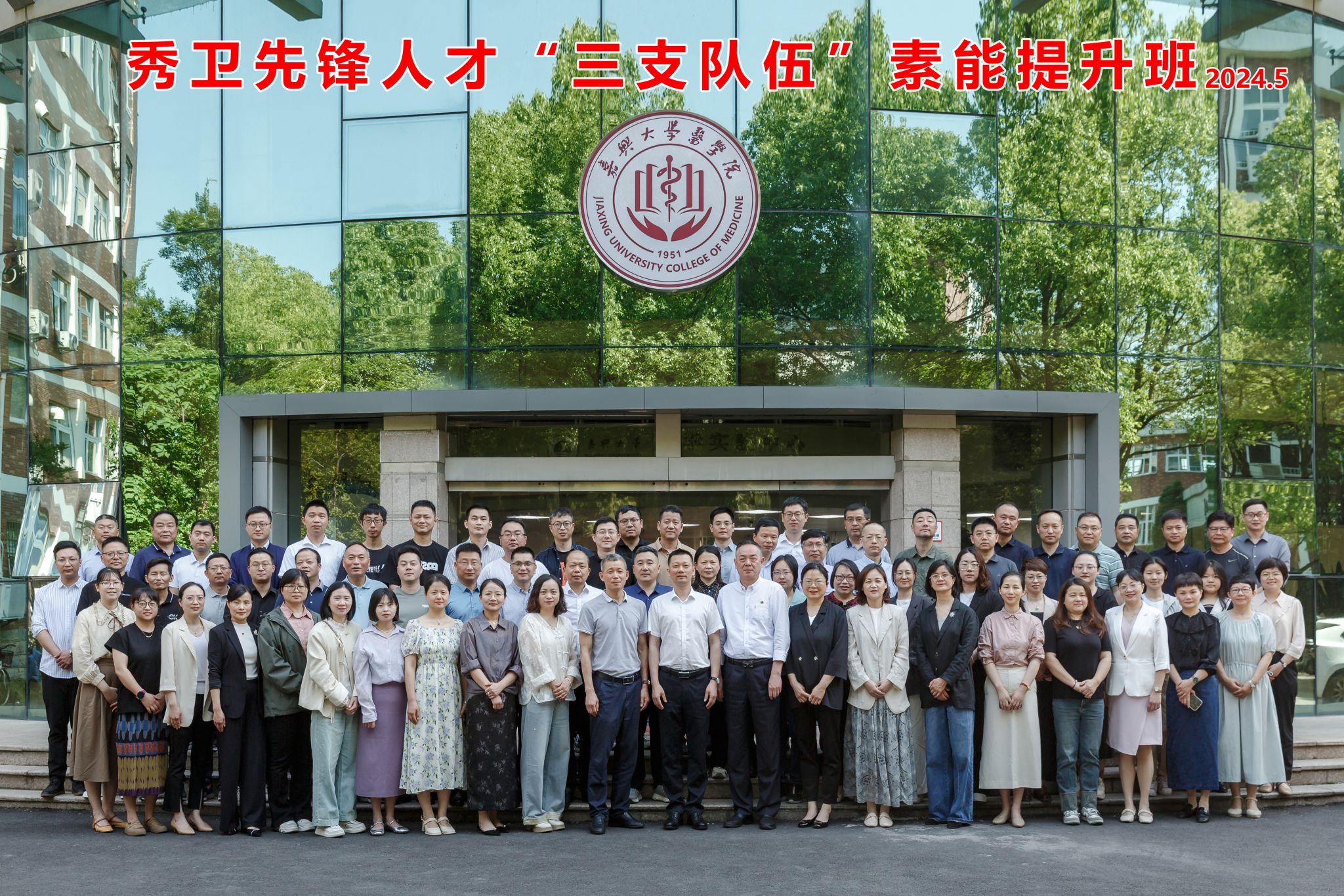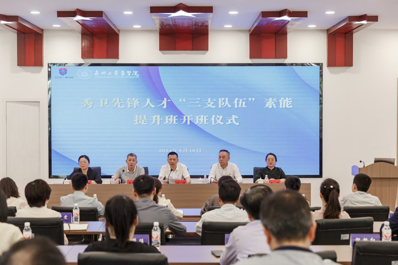 2024年5月18日,由yl永利集团官网登录和秀洲区卫健局合作举办的秀卫先锋人才“三支队伍”素能提升班开班仪式在yl永利集团官网登录举行。嘉兴市秀洲区卫健局党委书记、局长计俊,党委副书记、副局长周银军,党委委员、工会主席陈晓梅出席开班仪式,全区医疗机构班子成员、第一届秀卫青年人才综合素能提升班培训成员、局机关“8090”青年等共69人参加本次培训。永利集团官网公司党委书记陈云飞、党委副书记朱莹参加开班仪式。