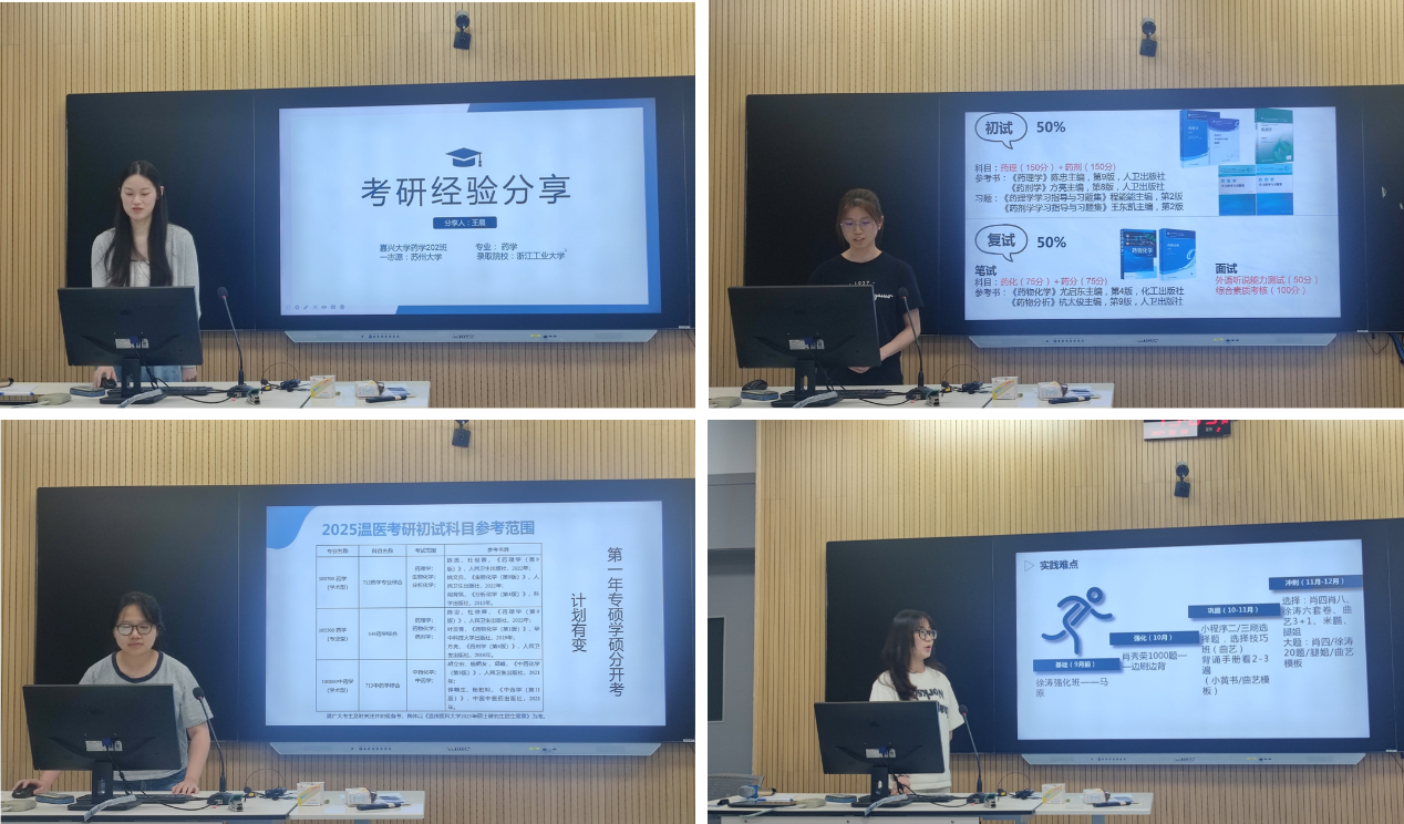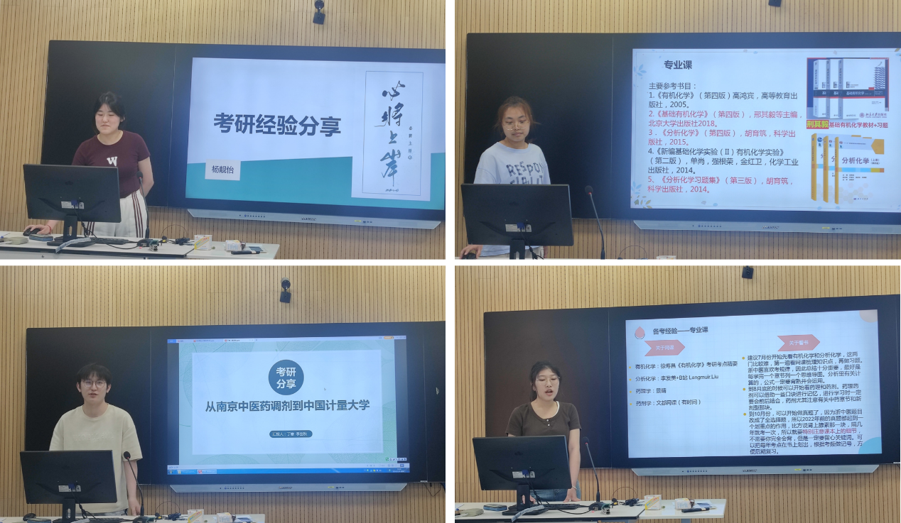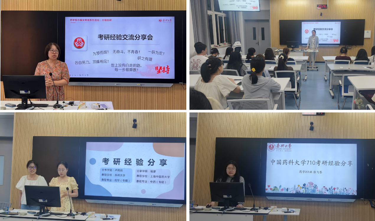2024年5月28日晚,药学系在仁心楼424教室举办了考研经验交流分享会。该活动作为“嘉兴市巾帼文明岗”药学系教师们为员工提供“巾帼助研”系列活动之一,旨在加强同学们对研究生考试的认识,增强考研斗志,为同学们提供实用的经验和备考建议。交流会由药学系主任黄越燕老师主持,班主任张晓勤老师及药学专业21级员工参加本次交流会。