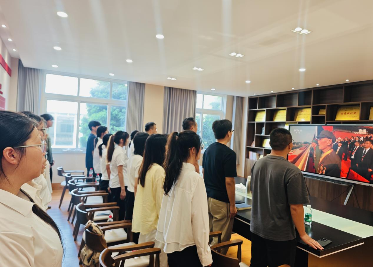 上午8时30分许,公司党员之家会议室已座无虚席。公司领导与辅导员、员工们一起等待阅兵仪式开始。