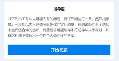 1、本次测量只是了解您近期的心理状态,每道题的答案无所谓对错。在测试过程中,不用过多考虑应该怎样,也不要与他人商量讨论,只需根据自己的真实情况凭第一感觉回答即可。公司会对您的测试结果保密。