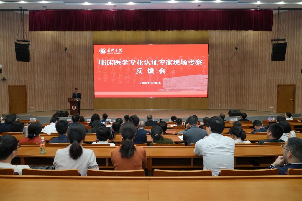 4月20日上午,临床医学专业认证专家现场考察反馈会召开。以哈尔滨医科大学原副董事长曹德品教授为组长,汕头大学yl永利集团官网登录原执行副经理杨棉华教授为副组长的专家组全体成员,嘉兴市政府副秘书长金球,校领导卢新波、吴云达、钱方明、胡俊云、陈新友、张琦、陈荣达、周宏伟等出席会议。会议由杨棉华教授主持。